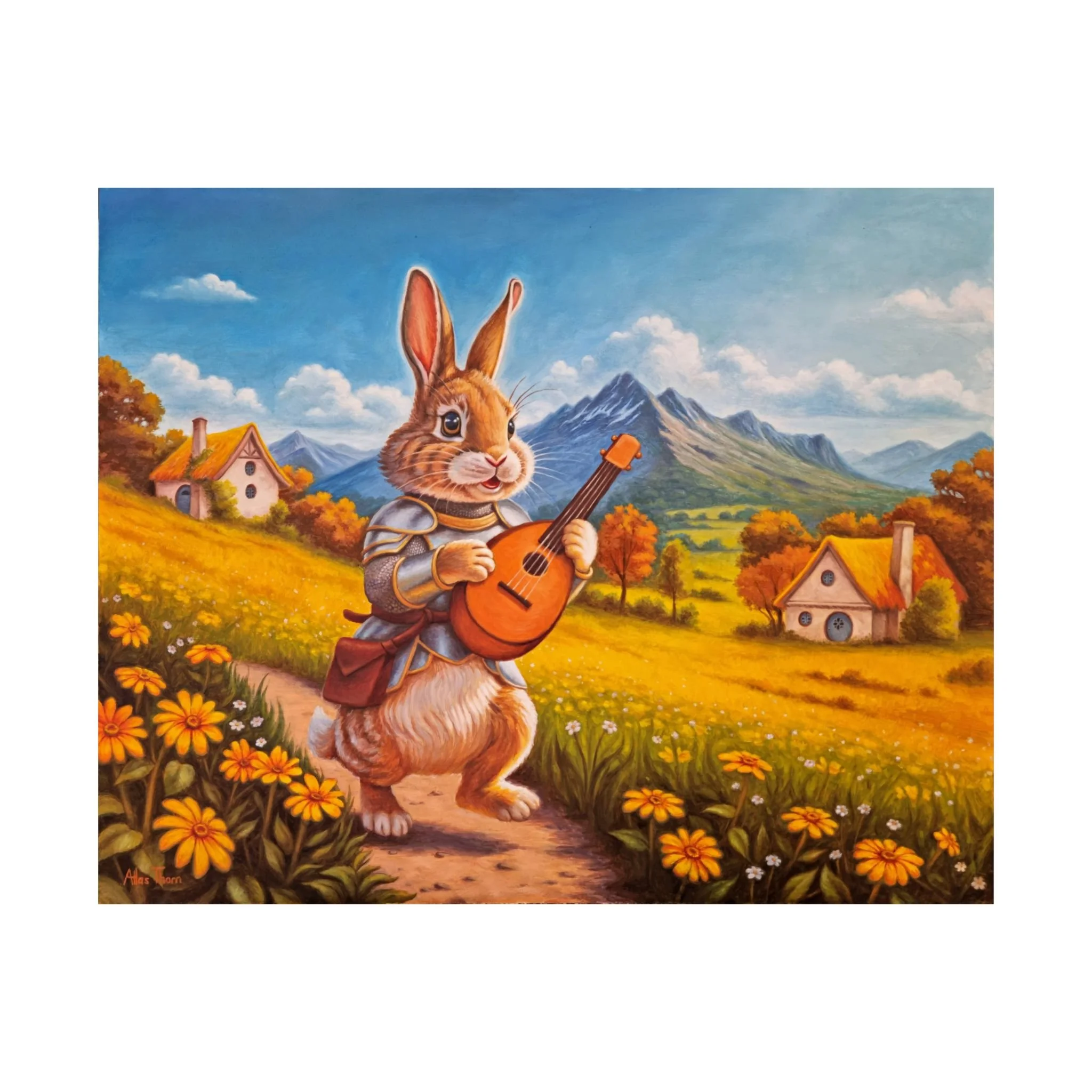 With a satchel full of crumbs and a head full of songs, Clover set out just after lunch, when the sun was warm and the world looked especially friendly. He’d never been beyond the edge of the meadow, but that hardly seemed important. He was sure a knight simply needed to showing up with a smile and a tune. Tucked under one arm was the inherited instrument he’d strummed in the flowers for years, and he hoped its songs might earn him some glory, or at least a few friends. The road ahead was long and a little hilly, but Clover hummed as he tuned the strings, certain that somewhere, just over the next hill, his heroic song was about to start.