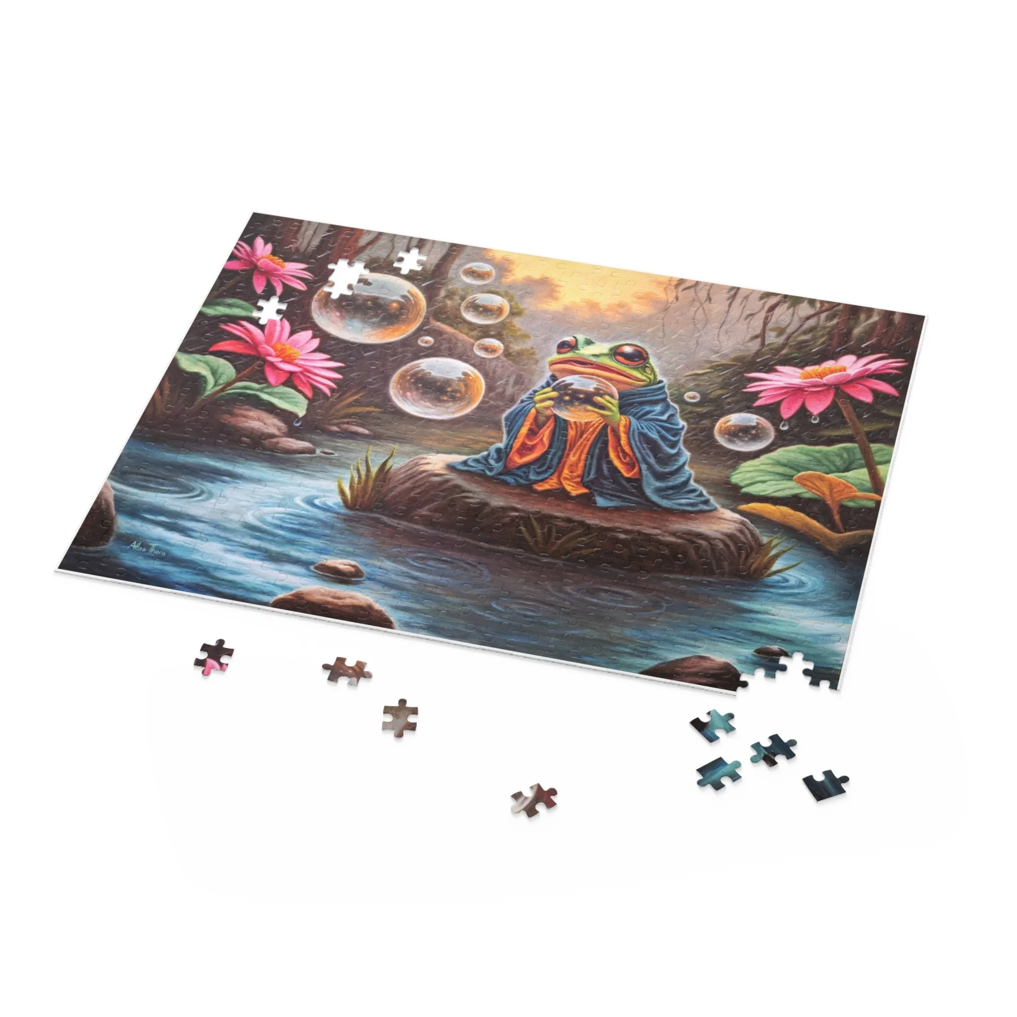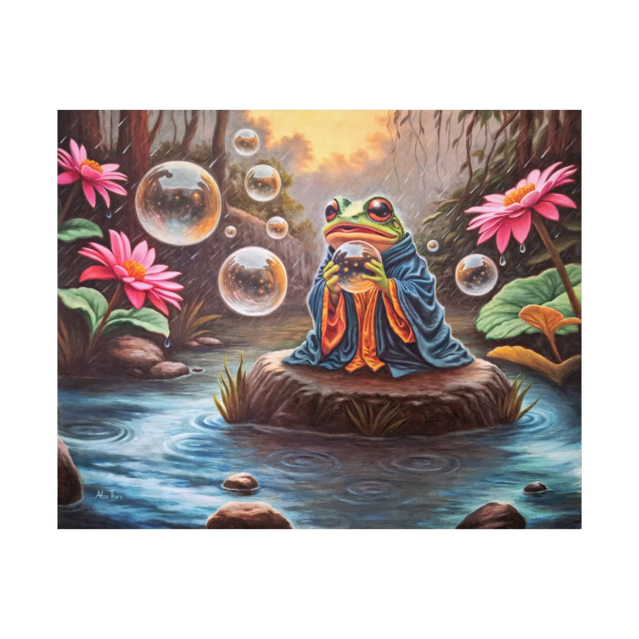 Quibble spent his days perched on a rock in the heart of the pond, listening patiently to the woodland residents who came with their questions and worries. A squirrel fretted over a missing nut, a hedgehog shaken by a wayward quill. Quibble offered calm advice and thoughtful croaks that eased their minds and clarified their problems. As he considered the nature of clarity and clam, his gaze drifted to the bubbles summoned around him. Each one caught a fragment of the world: sun, sky, water, past, and present, all twisting and bending them into a fleeting, perfect globe. Quibble wondered at how everything could be held so briefly, and yet so completely, in something so fragile... How perspectives could shift... How reflections could hold truth.