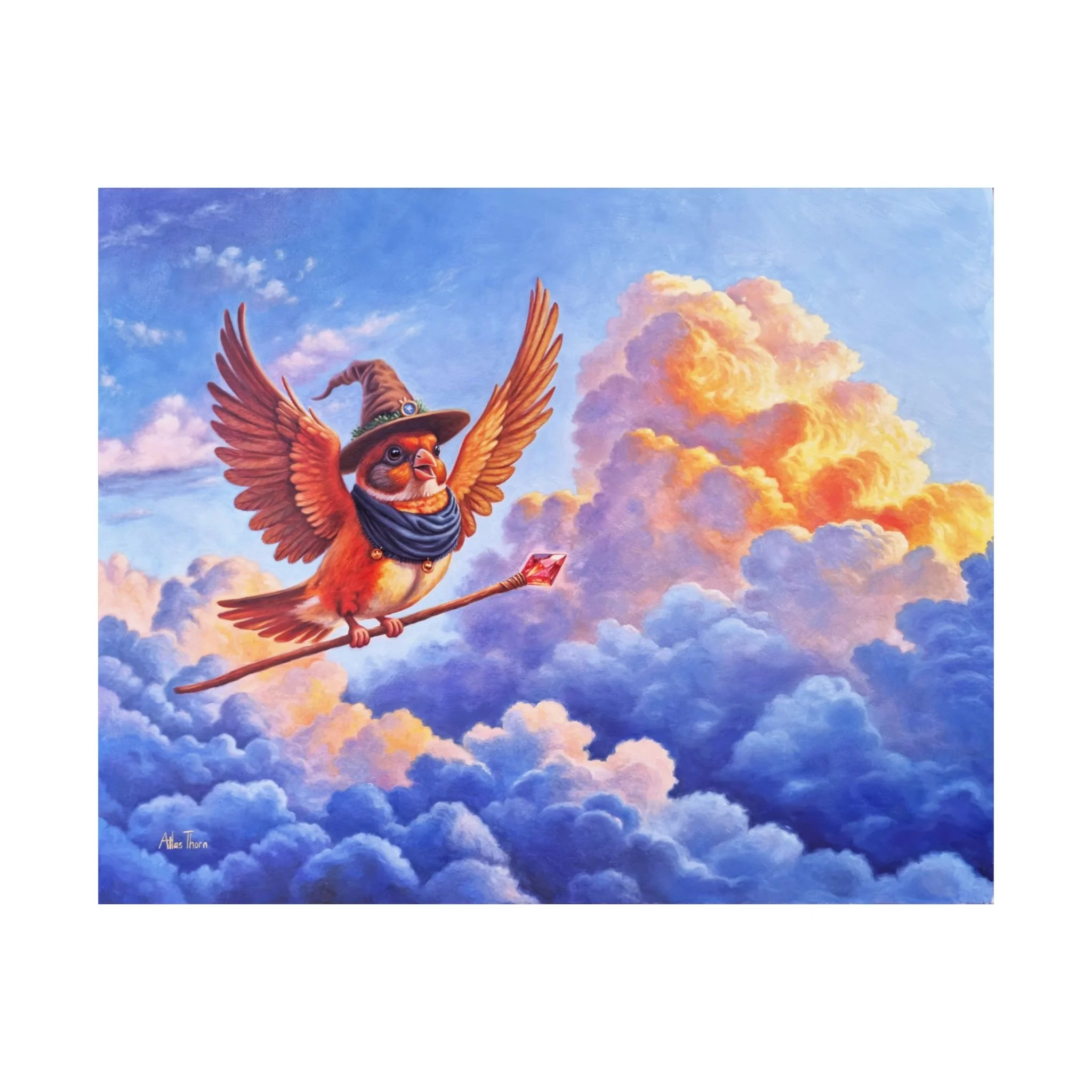 With the dawn still pink on the horizon, Marigold beat her small wings against the morning air, a magic staff glowing faintly in her grip. It had been a gift from her wise friend Quibble, who saw the restlessness in her and promised it would carry her further than the orchards and shrubs of home. The staff’s magic let her tug at the sky itself, pulling the winds to her feathers, guiding the currents beneath her flight. Every finch in her family had circled the same hills for generations, but Marigold’s heart ached for more. The clouds answered her call as she climbed higher, and the wind wrapped around her like a friend. With every flap of her wings, she knew she was chasing adventure and today, she would fly farther than any of her kin had ever dreamed.